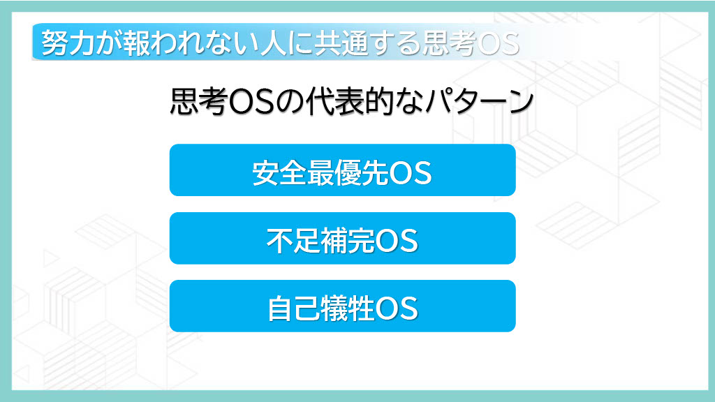 人生を裏側で動かしている設計図(OS)には、 代表的な3つのパターンがあるそうです。