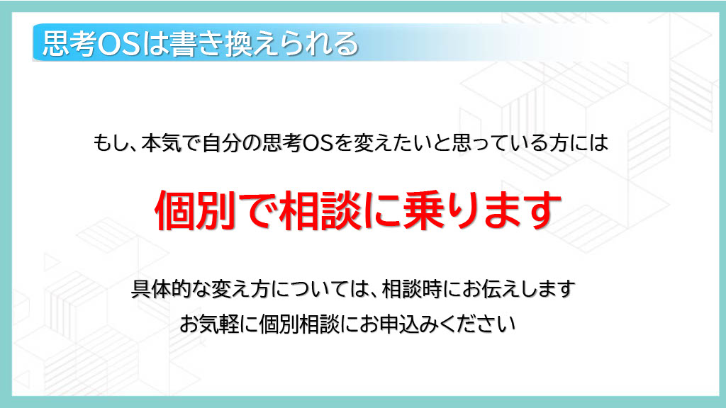 本気でOSを書き換えたい、人生のステージを変えたいという方には、 個別相談も受け付けているそうです。