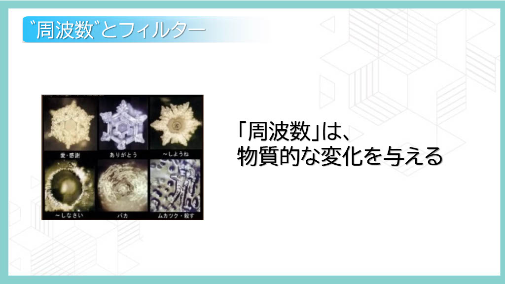 「ありがとう」という言葉と「クソ」という言葉では、 水の結晶の形が劇的に変わるように、 わたしたちが発する周波数が、人生の設計図を書き換えていきます。